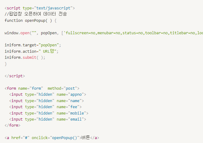 전달할 data 들을 FORM 태그 안에 hidden으로 넣어두었다.