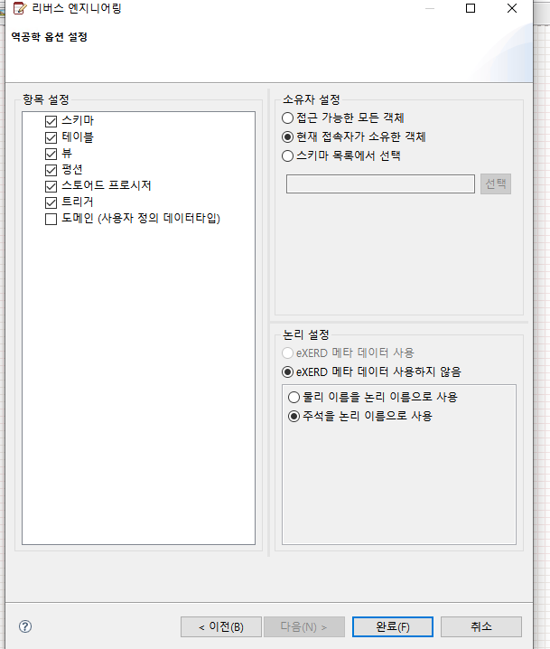 리버스 엔지니어링은 이미 존재하는 데이터 베이스에 연결해서 그 스키마 구조를 가져와서